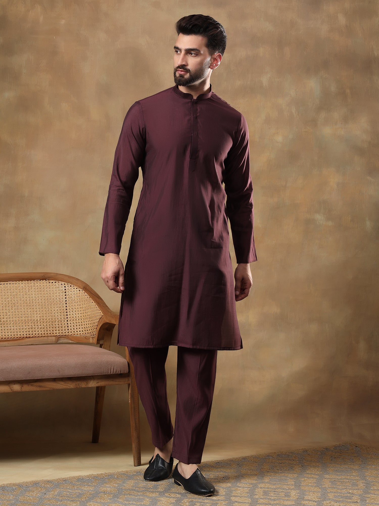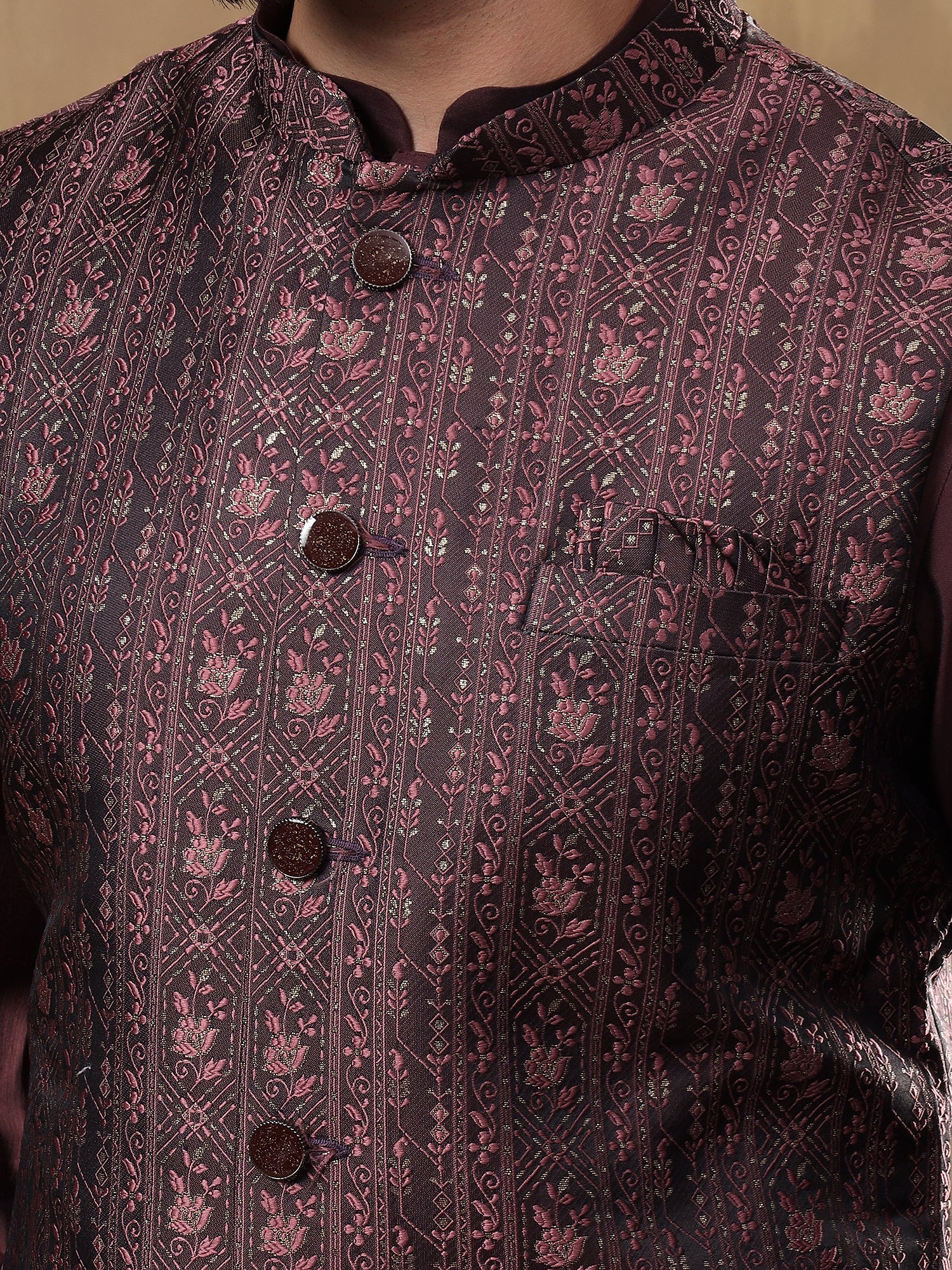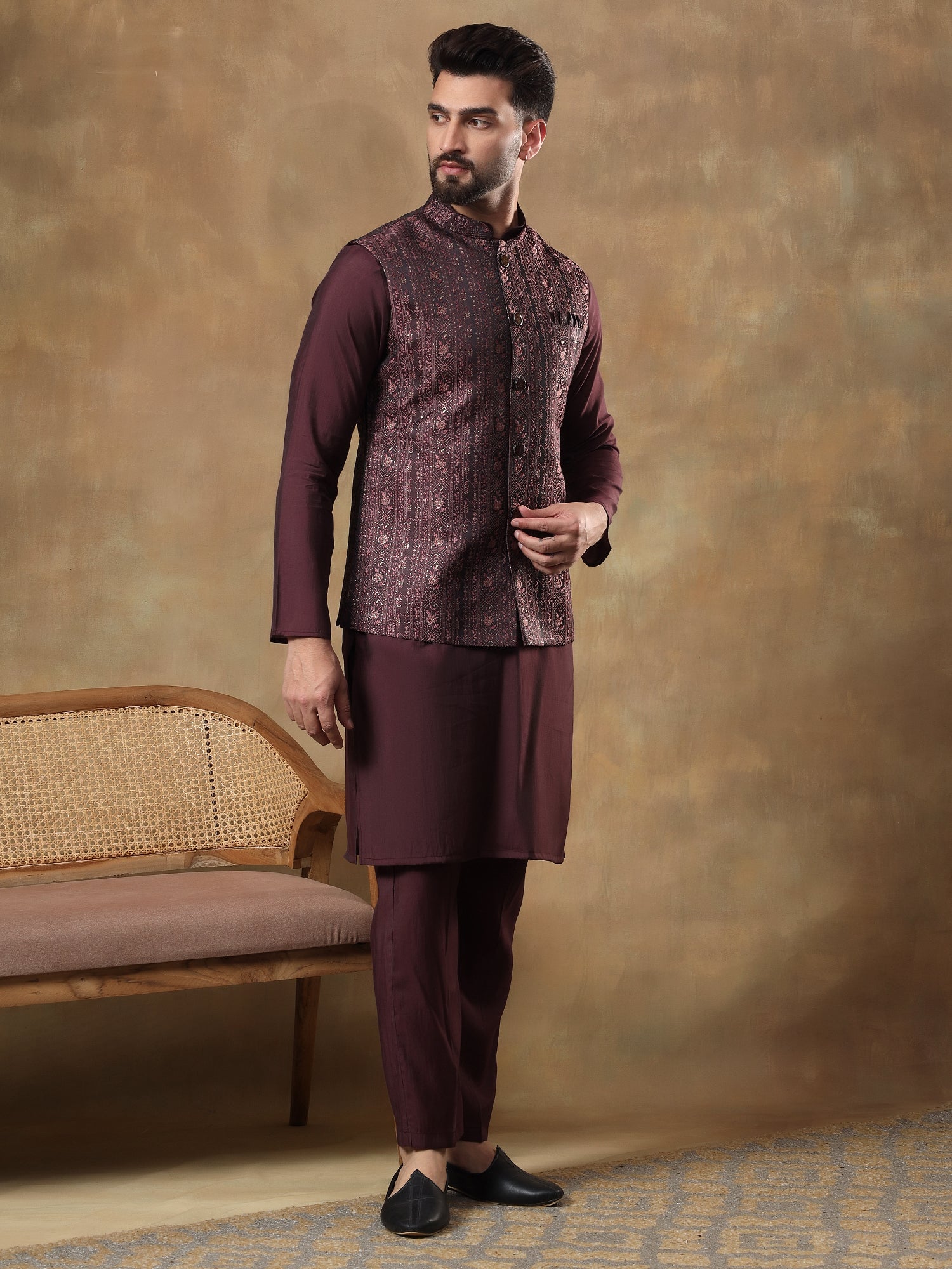 Elevate your festive attire with our grape wine jacket set for men, featuring exquisite belbuti patterns. Crafted from luxurious fabric, this set combines the rich, earthy tones of mehndi green and wine color with intricate floral and leaves patterns, adding a touch of elegance and cultural heritage. Perfect for weddings and festive occasions, this jacket set exudes sophistication and style. Pair it with tan leather juttis for a polished and refined look that stands out.